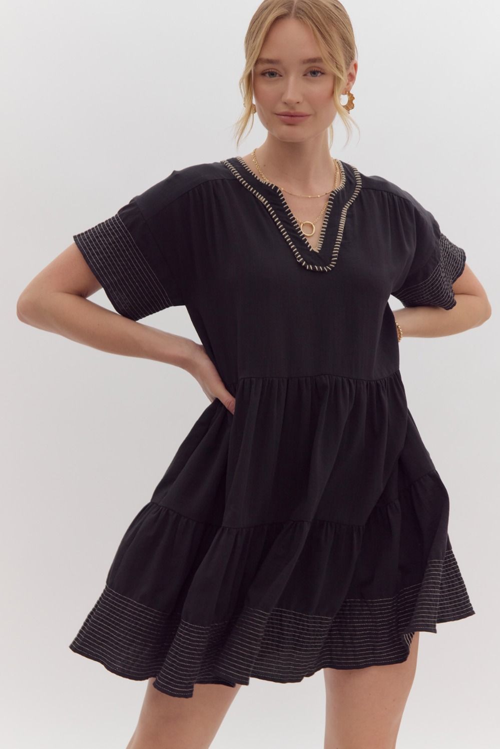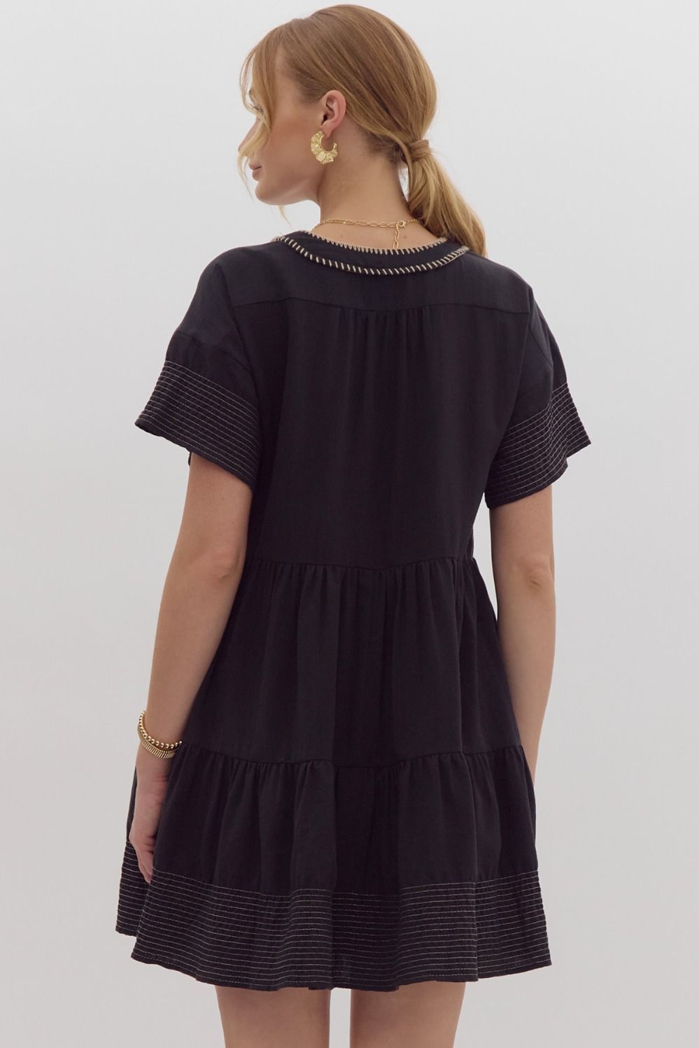 Black with taupe stitching, tiered, pockets