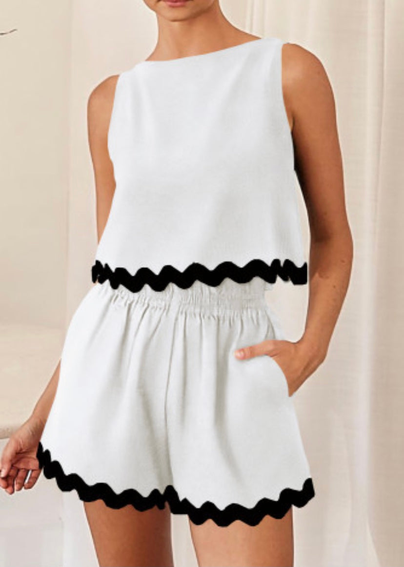 White shorts with black ric rac trim