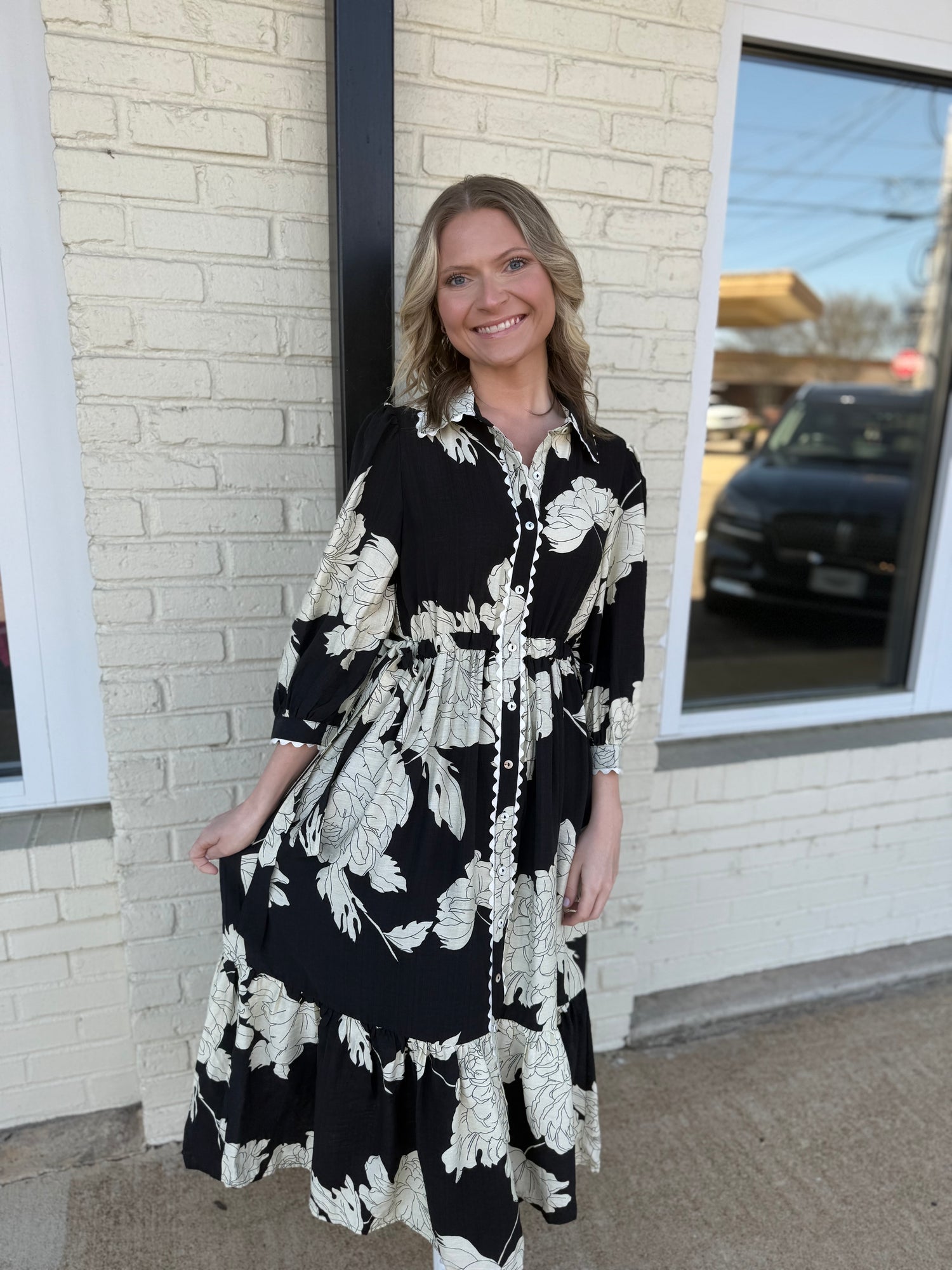 Black floral ric rac trim midi