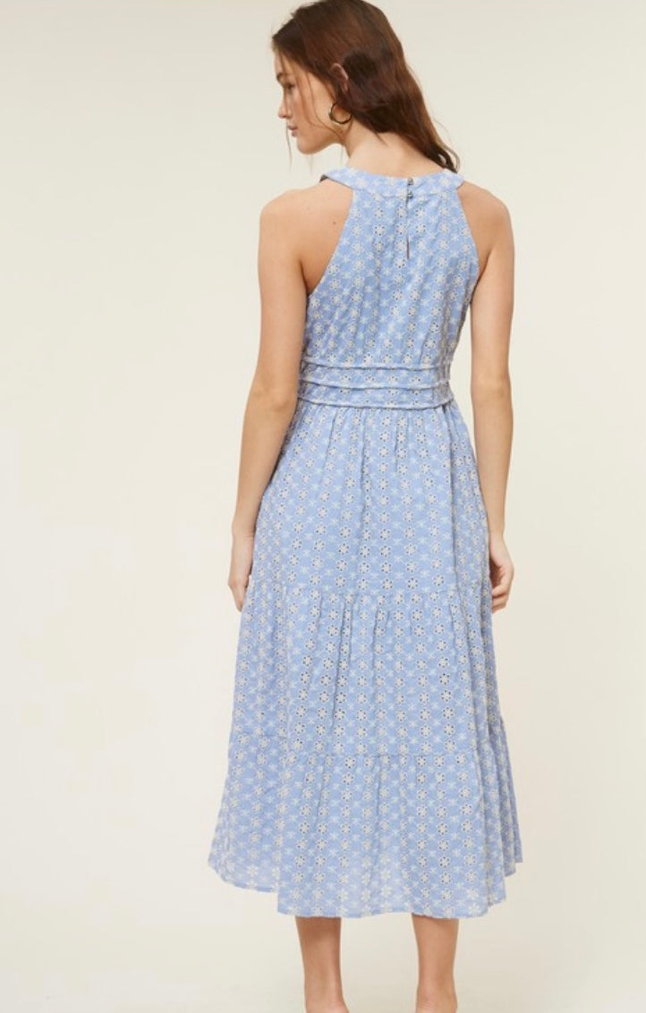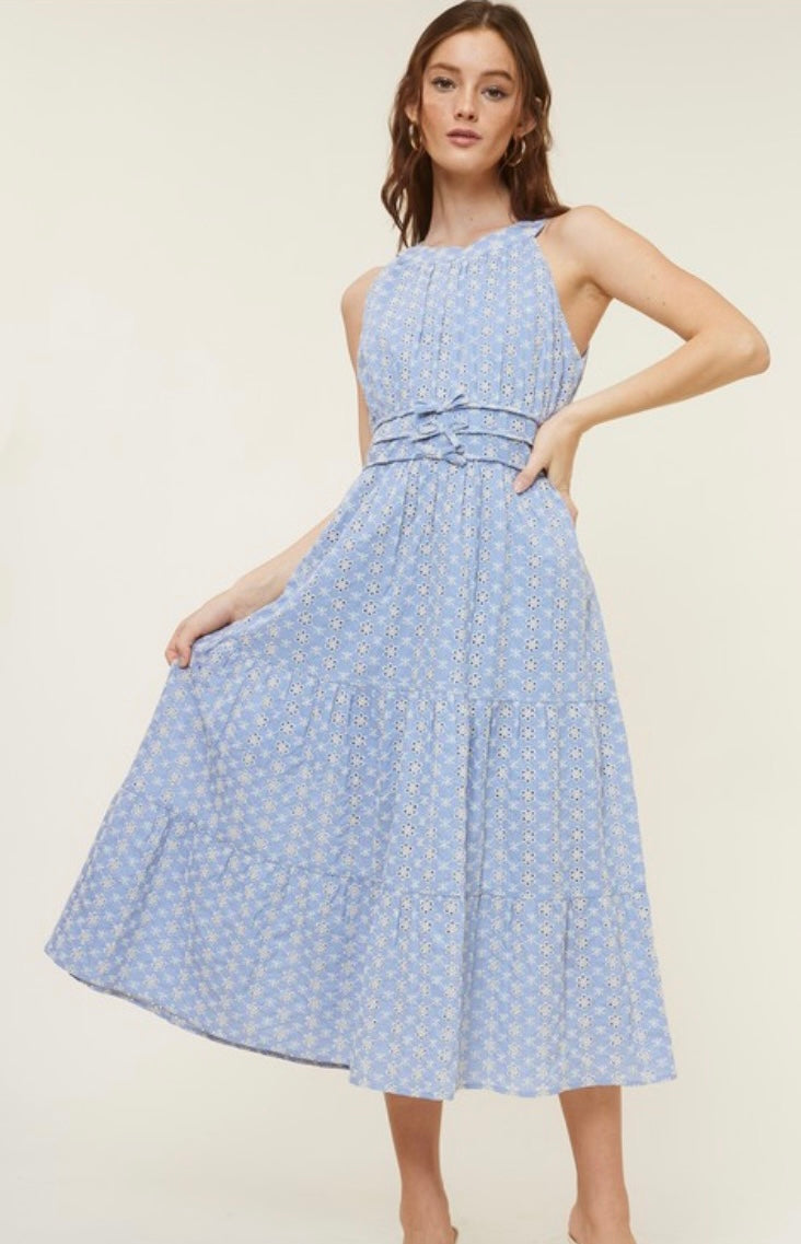 Blue and white eyelet midi dress
