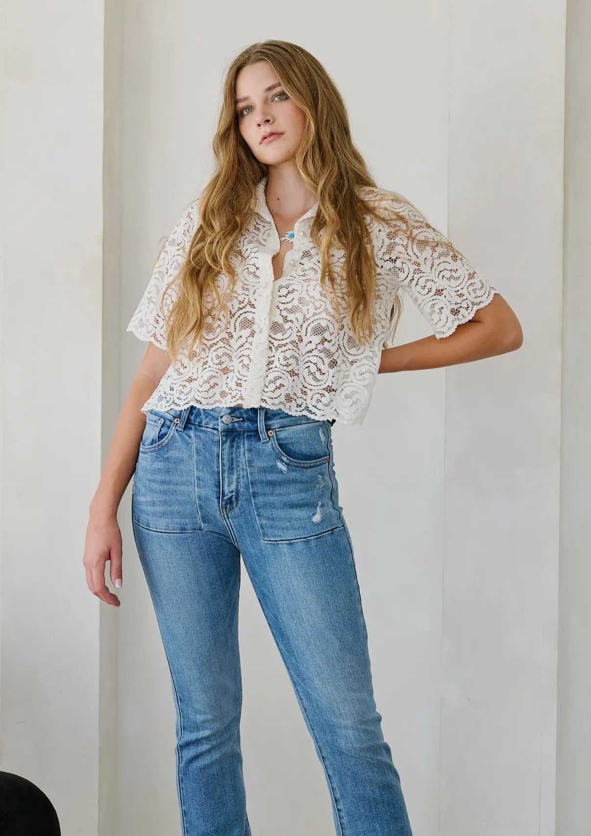 Medium wash, tummy control panel, 67% cotton, 25% lyocell, 6% polyester, 2% spandex