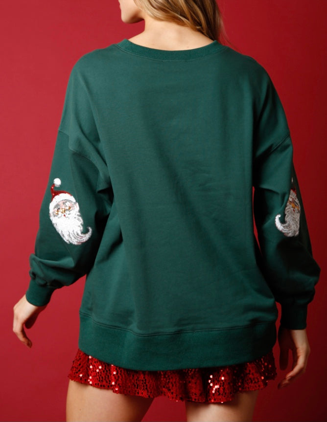 Hunter green sweatshirt with sparkly Santas