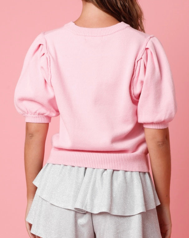 Sparkly letters, puff sleeves