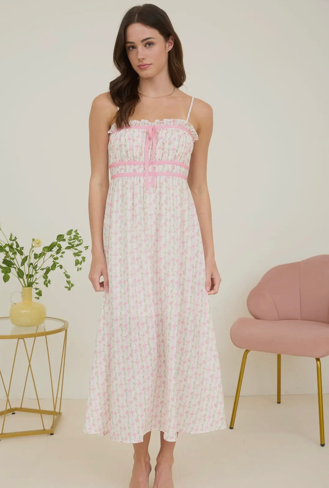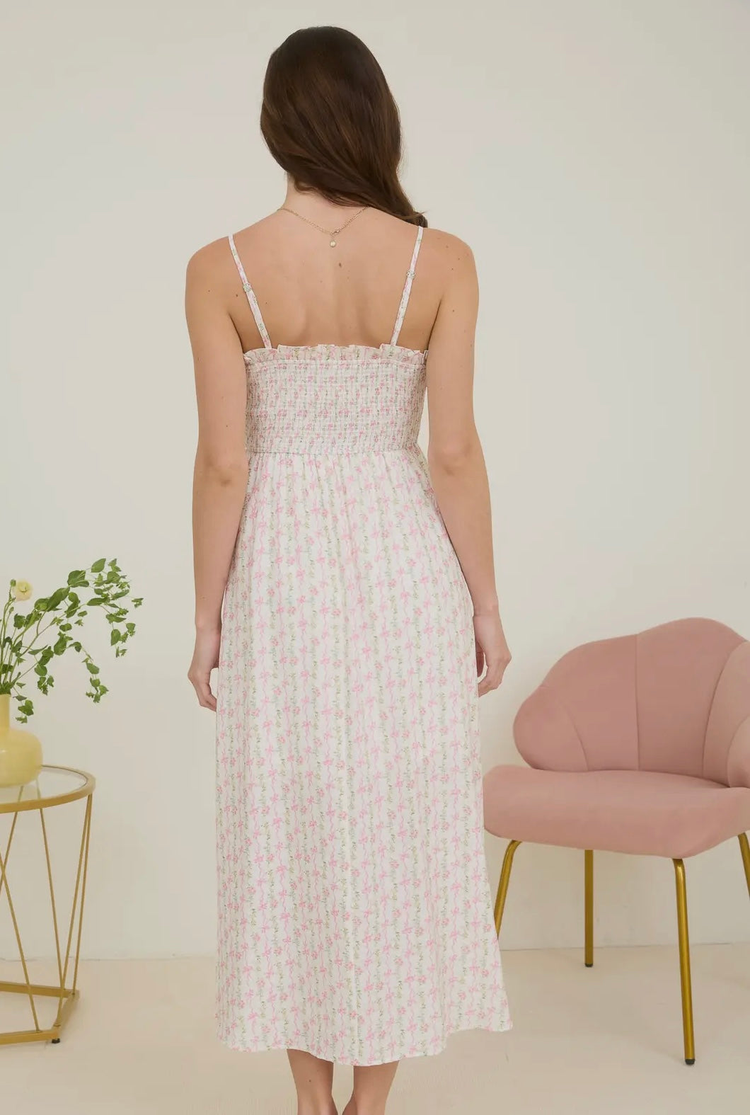 Pink bow print midi dress