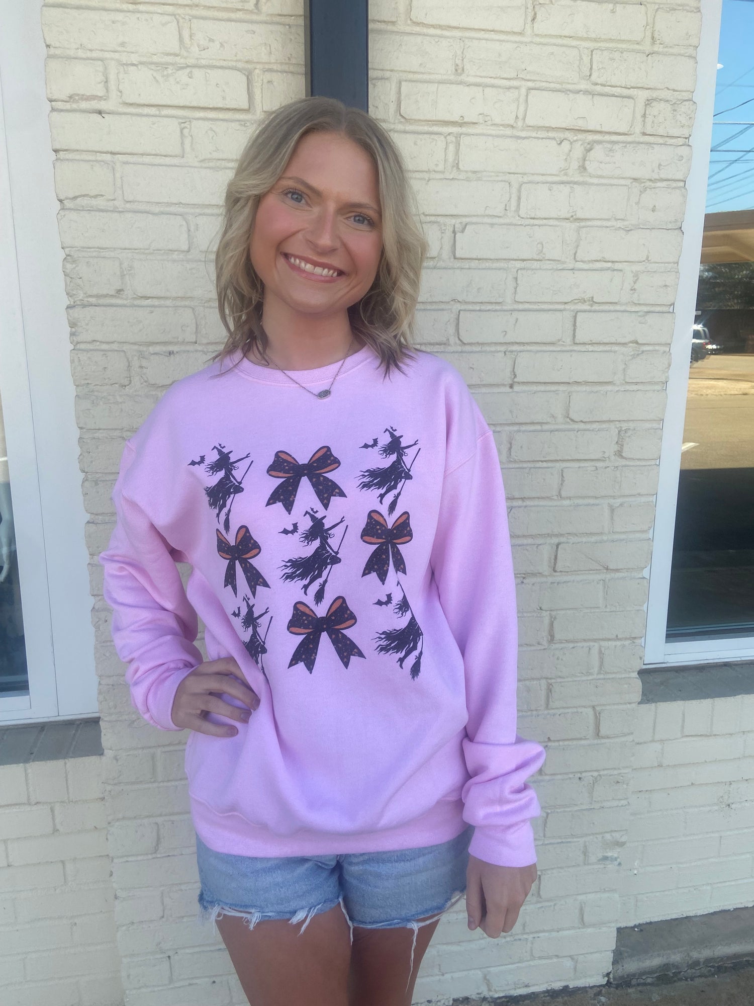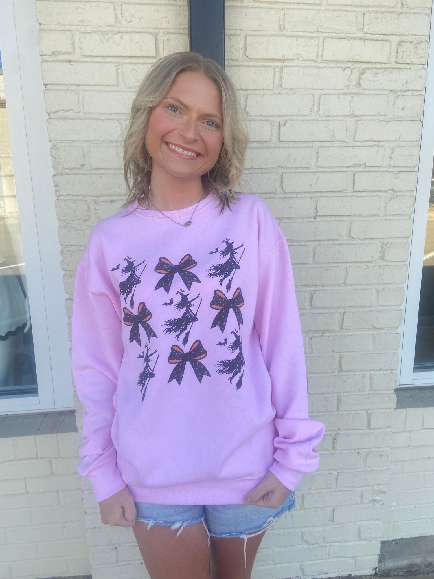 Pink sweatshirt, witches and bows graphic